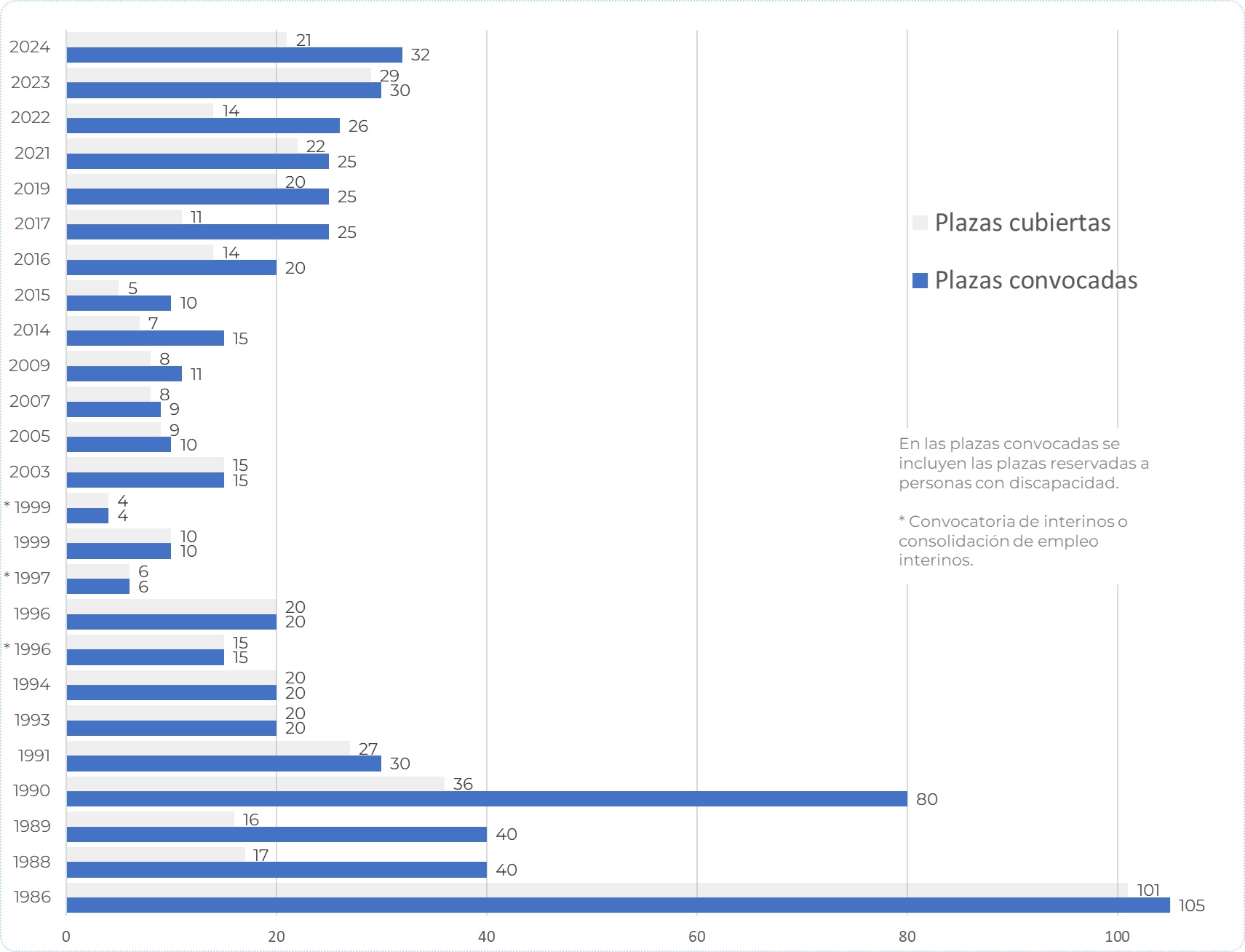 En esta sección se ofrece el gráfico con los datos sobre las plazas convocadas y cubiertas en los últimos años en la oposición al Cuerpo Técnico de Auditoría y Control Externo del TCu, en las diferentes modalidades de turno libre, de reserva por consolidación de empleo o de interinos. Las convocatorias están ordenas según las Ofertas Públicas de Empleo (OEP).
